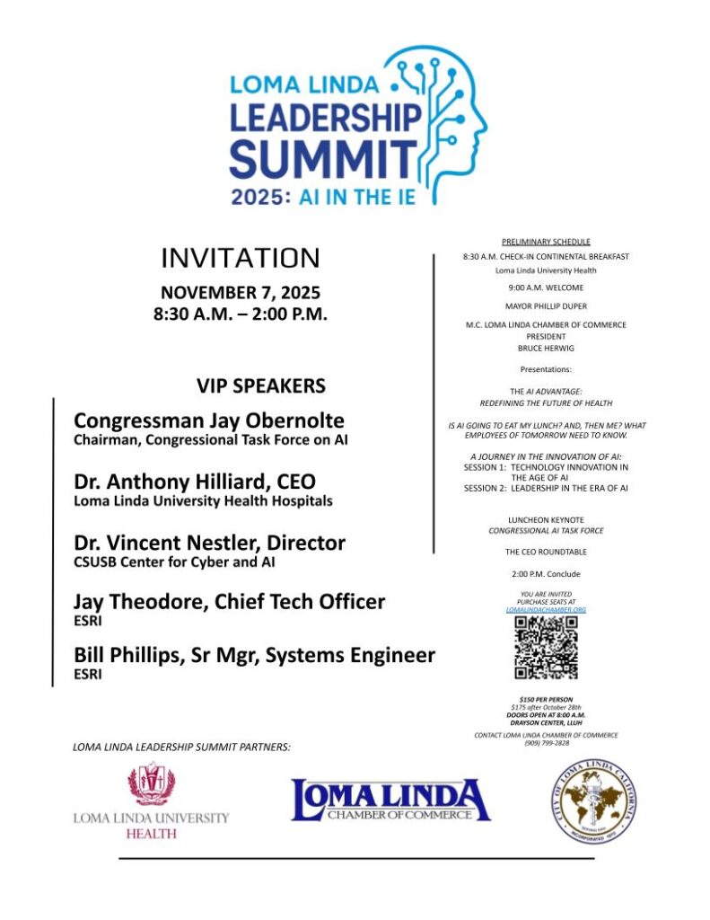 Our first Loma Linda Leadership Summit was a huge success. On November 7, 2025, over 80 people from throughout the region attended and engaged in this one of a kind event. The partnership of the City of Loma Linda, Loma Linda University Health Hospitals, and the Loma Linda Chamber of Commerce brought together experts to share from their experience and explore new concepts in Ai.